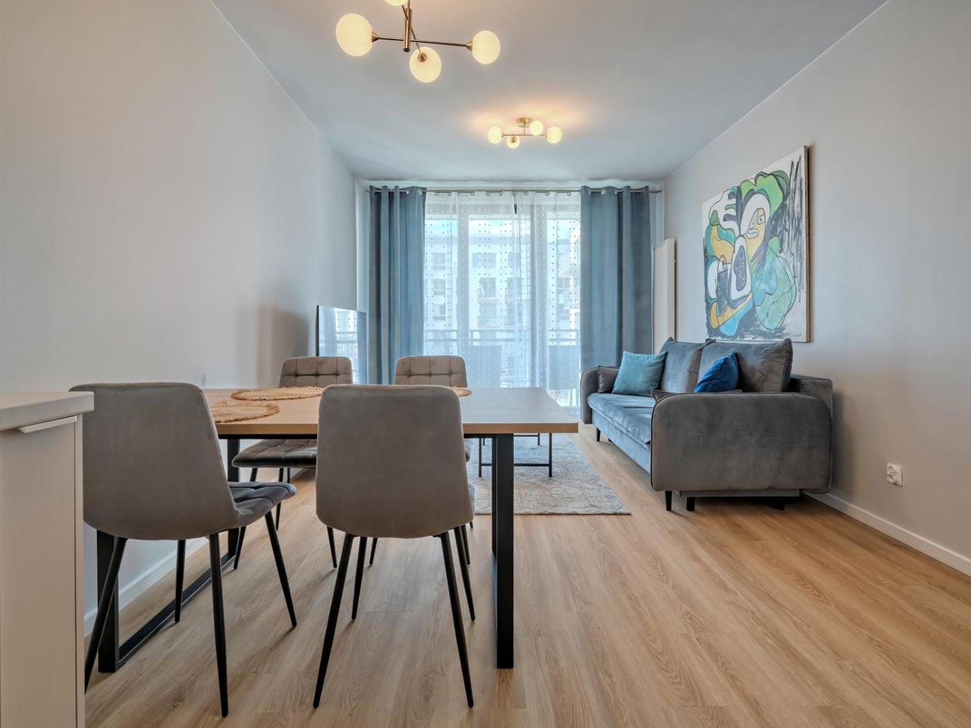 Apartament z 1 sypialnią. Featuring a private entrance, this apartment comprises 1 living room, 1 separate bedroom and 1 bathroom with a shower and a hairdryer. Meals can be prepared in the kitchen, which comes with a stovetop, a refrigerator, a dishwasher and kitchenware. The apartment features parquet floors, a seating area with a flat-screen TV, a washing machine, a tea and coffee maker as well as city views. The unit offers 2 beds. Apartament - 4 osobowy. Powierzchnia pokoju ok.: 43 mkw.