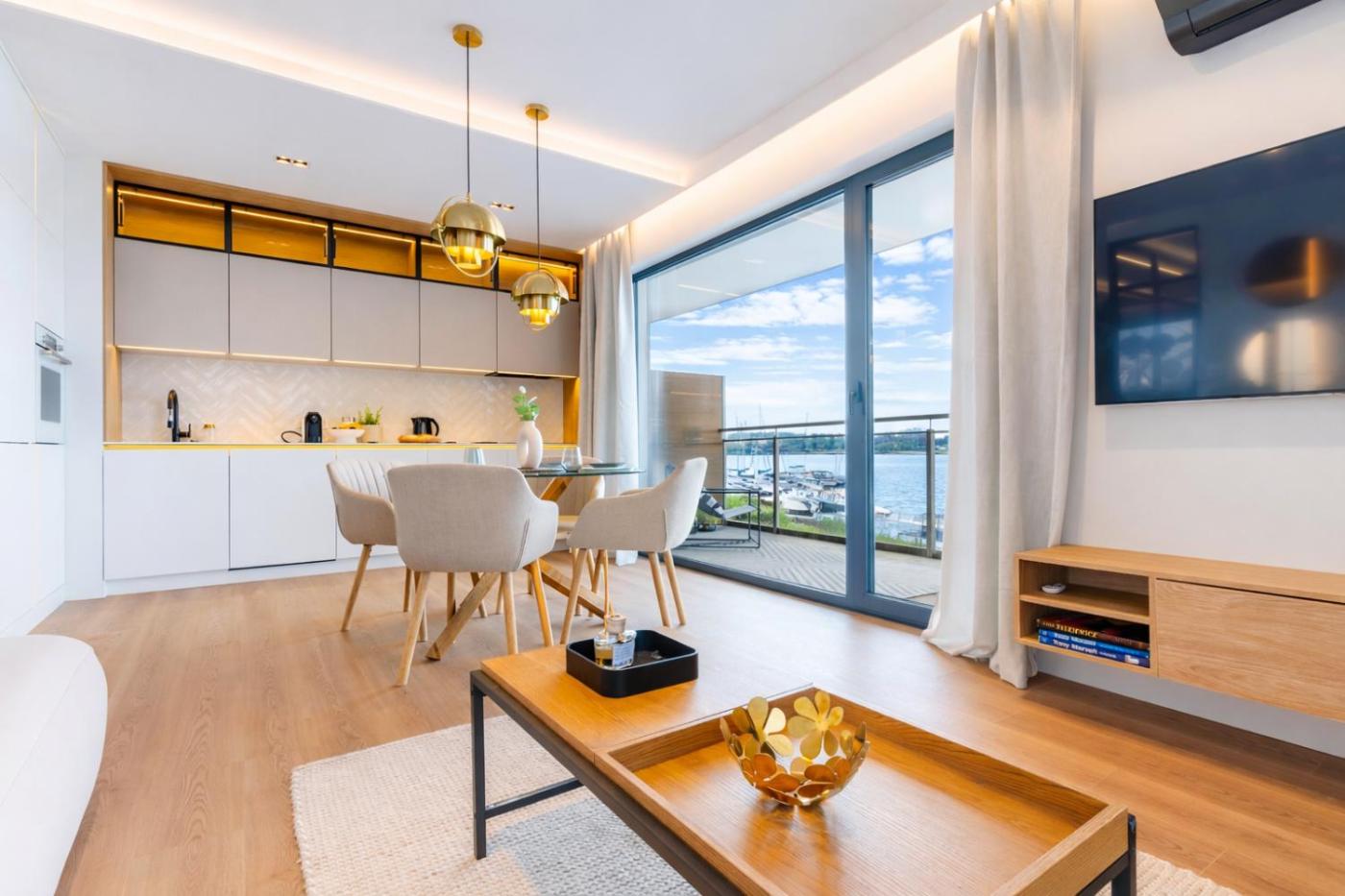 Apartament z 2 sypialniami. Featuring a private entrance, this air-conditioned apartment comprises 1 living room, 2 separate bedrooms and 1 bathroom with a walk-in shower and a hairdryer. Guests can make meals in the kitchenette that comes with a stovetop, a refrigerator, a dishwasher and kitchenware. Boasting a balcony with lake views, this apartment also provides a washing machine and a flat-screen TV with streaming services. The unit offers 5 beds. Apartament - 6 osobowy. Powierzchnia pokoju ok.: 60 mkw.